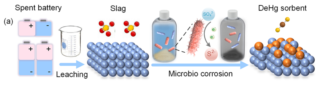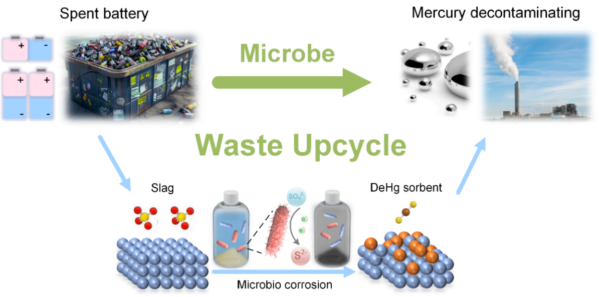 该团队的相关系列成果近期在环境工程与化学化工领域国际顶级期刊Chemical Engineering Journal(中科院一区,2024年影响因子IF=13.2)连续发表5篇论文,编号分别为:Chem Eng J, 2025, 521: 166827;Chem Eng J, 2025, 521: 166679;Chem Eng J, 2025, 507: 160735;Chem Eng J, 2024, 488: 150572;Chem Eng J, 2024, 500: 156656。其中一篇题为“Upcycling waste battery slag into amorphous metal sulfide via microbial-induced corrosion for efficient flue gas Hg⁰ removal”的研究,受自然界微生物腐蚀过程启发,创新利用硫酸盐还原菌在常温常压下,驱动电池废渣中金属硫酸盐发生溶解-还原-重沉积协同反应,最终在电子废弃物基底原位生成无定形金属硫化物,大幅提升了材料对烟气汞(Hg⁰)的选择性去除能力。该生物转化路径彻底规避了传统高温热解、溶剂热或等离子体法的高能耗与高碳排放问题,既契合“以废治废”的绿色化学理念,又在能耗控制、碳减排及工程适用性上展现出广阔前景,为我国危险废物焚烧烟气深度净化提供了新思路。