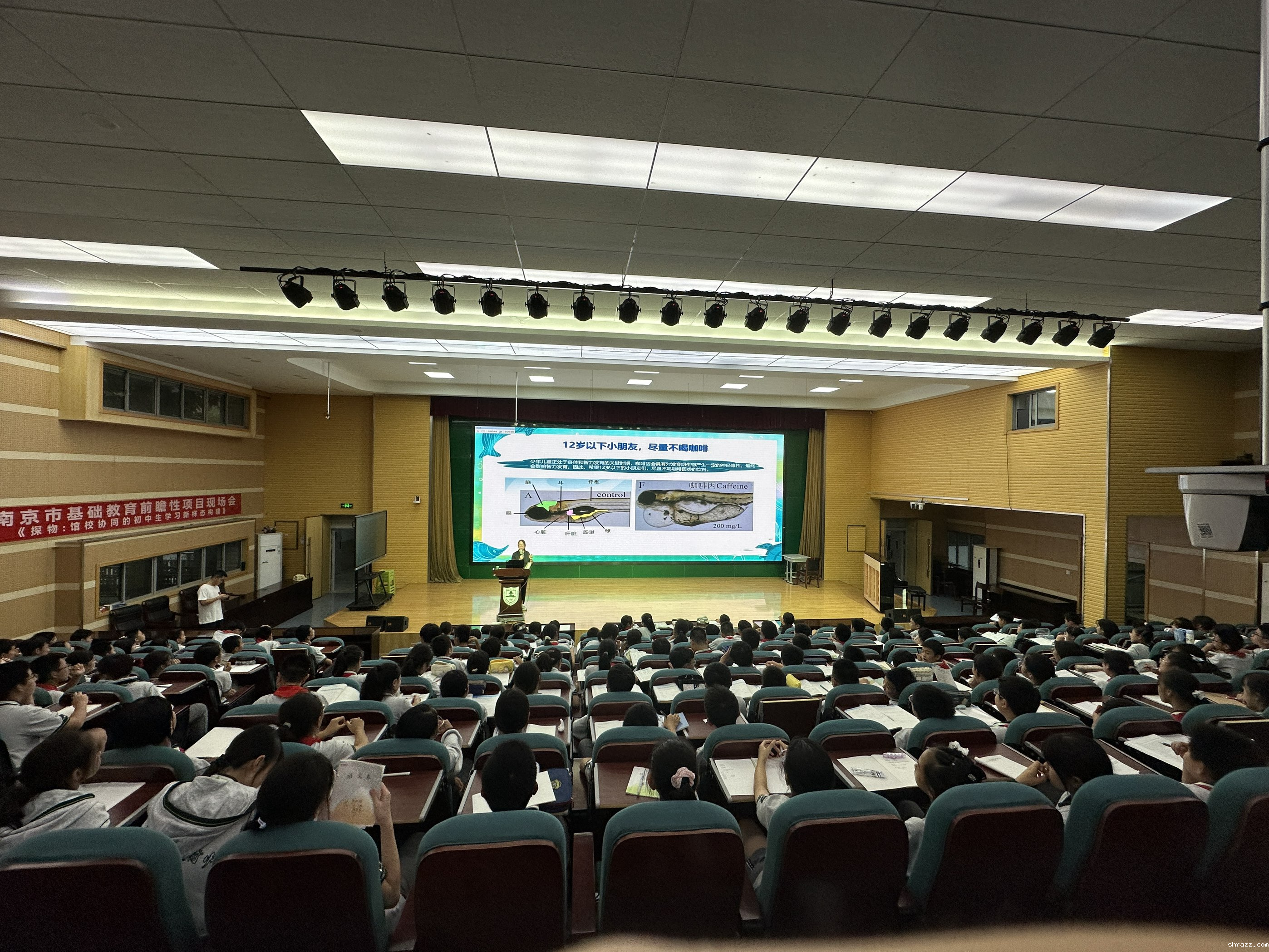 讲座以“什么是环境污染物”切入,系统梳理了大气、水、土壤三大领域的典型污染物,结合示意图与全球污染案例,王娜研究员帮助青少年直观认识污染物的危害,并进一步解读了抗生素、微塑料等新污染物的特点,强调其对生态环境与人体健康的潜在威胁及治理重要性。课堂上还以“生态毒理学”为主线,生动讲解斑马鱼的发育过程,并通过对比实验展示酒精、咖啡因、废电池对斑马鱼的影响,使抽象的科研结论变得贴近生活,易于理解。