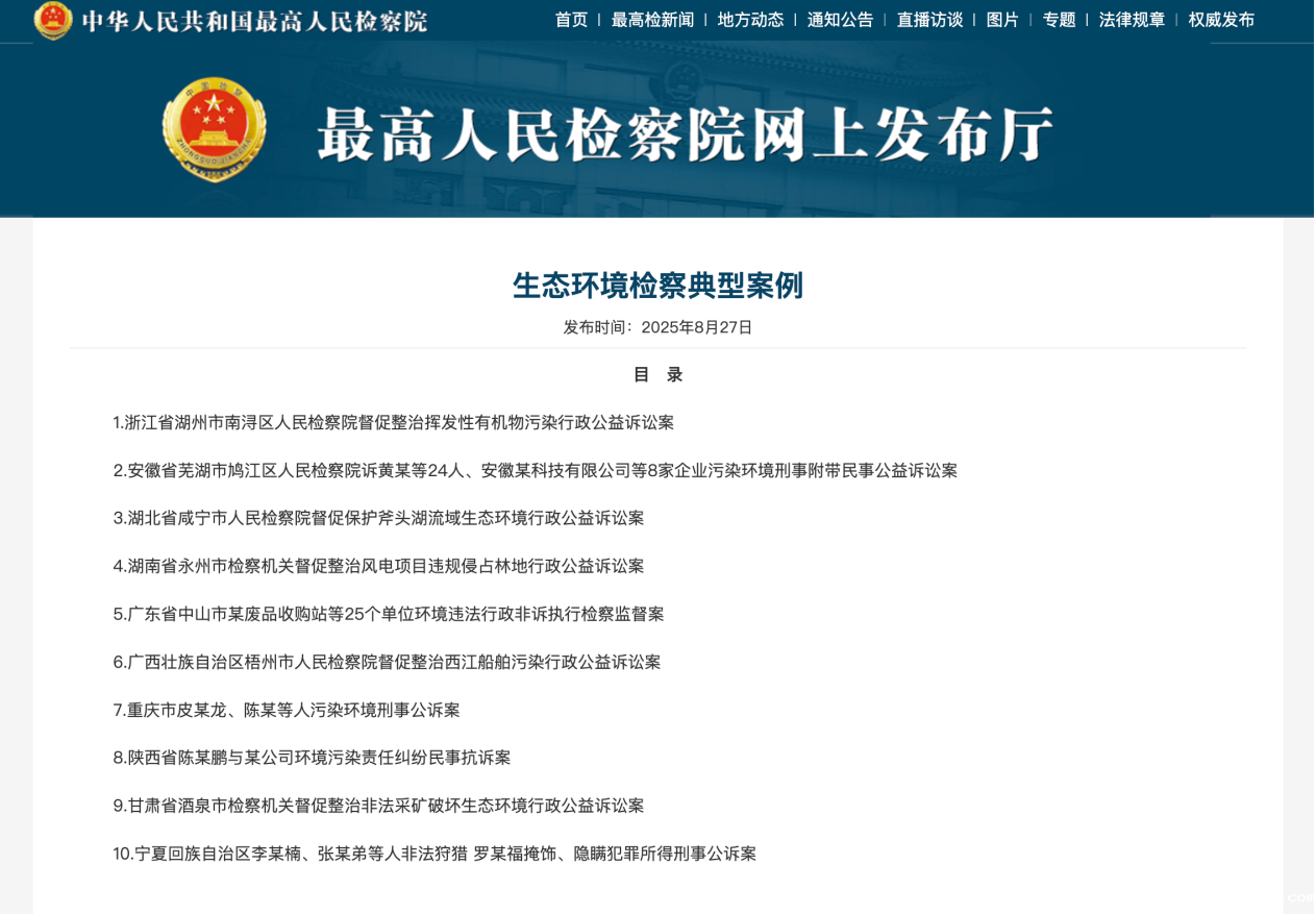 2025年8月27日,全国生态环境检察工作推进会在浙江湖州召开,最高人民检察院发布了2022—2025年度全国生态环境检察典型案例。由我所固体废物污染防治研究中心牵头开展司法鉴定的“安徽省芜湖市鸠江区人民检察院诉黄某等24人、安徽某科技有限公司等8家企业污染环境刑事附带...